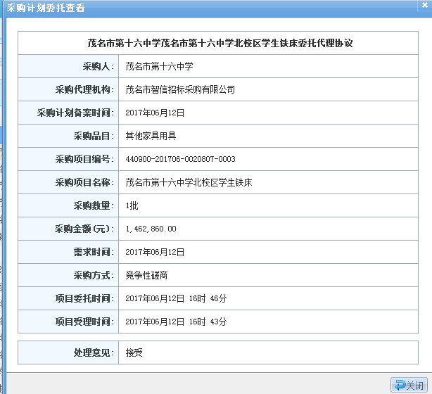 二、采購項目名稱:茂名市第十六中學北校區學生鐵床