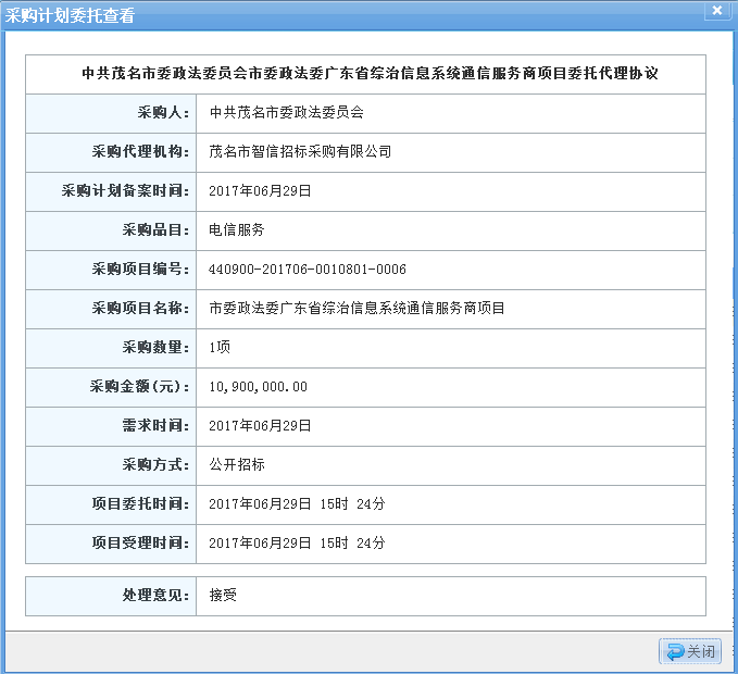 茂名市智信招標采購有限公司 受 中共茂名市委政法委員會的委托,對 市委政法委廣東省綜治信息系統通信服務商項目 進行公開招標采購,歡迎符合資格條件的供應商投標。