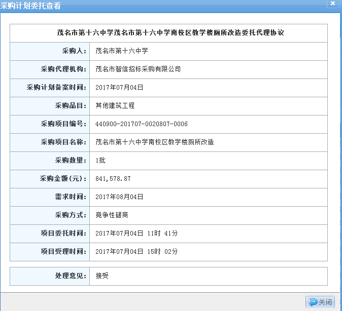 茂名市智信招標采購有限公司 受 茂名市第十六中學 的委托,擬對 茂名市第十六中學南校區教學樓廁所改造 進行競爭性磋商,歡迎符合資格條件的供應商參加。本項目將優先確定符合相應資格條件的自主創新產品、節能產品、環保產品供應商參加談判。