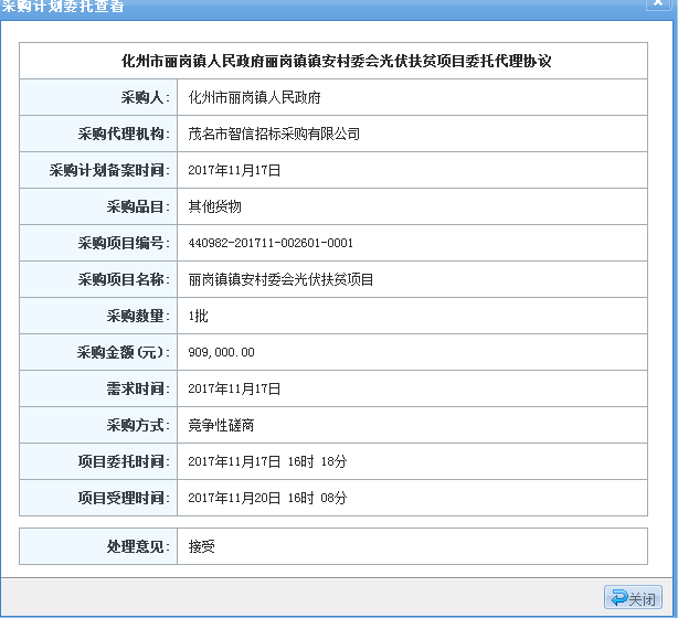 茂名市智信招標采購有限公司 受 化州市麗崗鎮人民政府 的委托,擬對 麗崗鎮鎮安村委會光伏扶貧項目 進行競爭性磋商,歡迎符合資格條件的供應商參加。本項目將優先確定符合相應資格條件的自主創新產品、節能產品、環保產品供應商參加談判。