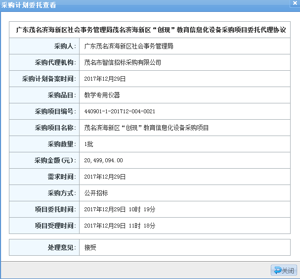 茂名市智信招標采購有限公司 受 廣東茂名濱海新區社會事務管理局的委托,對 茂名濱海新區“創現”教育信息化設備采購項目 進行公開招標采購,歡迎符合資格條件的供應商投標。